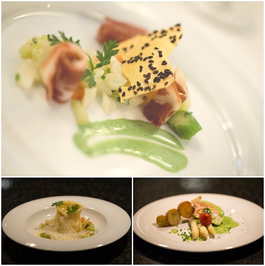 Anschließend gab es ein Spargelraviolo auf Nußbutterschaum und dazu einen 2014er Weißburgunder vom Weingut Schäfer-Fröhlich und ein 2014er Grillo aus Italien vom Weingut Feudo Maccari.